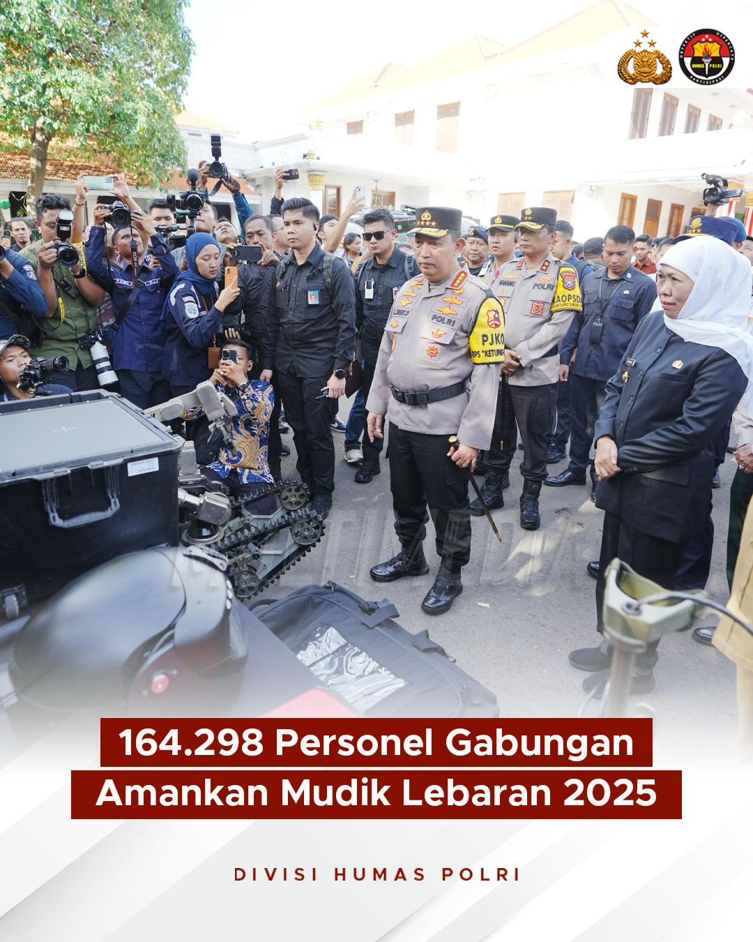 SURABAYA, BUSERJATIM.COM – Menjelang Hari Raya Idul Fitri 1446 H, sebanyak 164.298 personel gabungan disiagakan untuk mengamankan arus mudik dan arus balik Lebaran 2025.