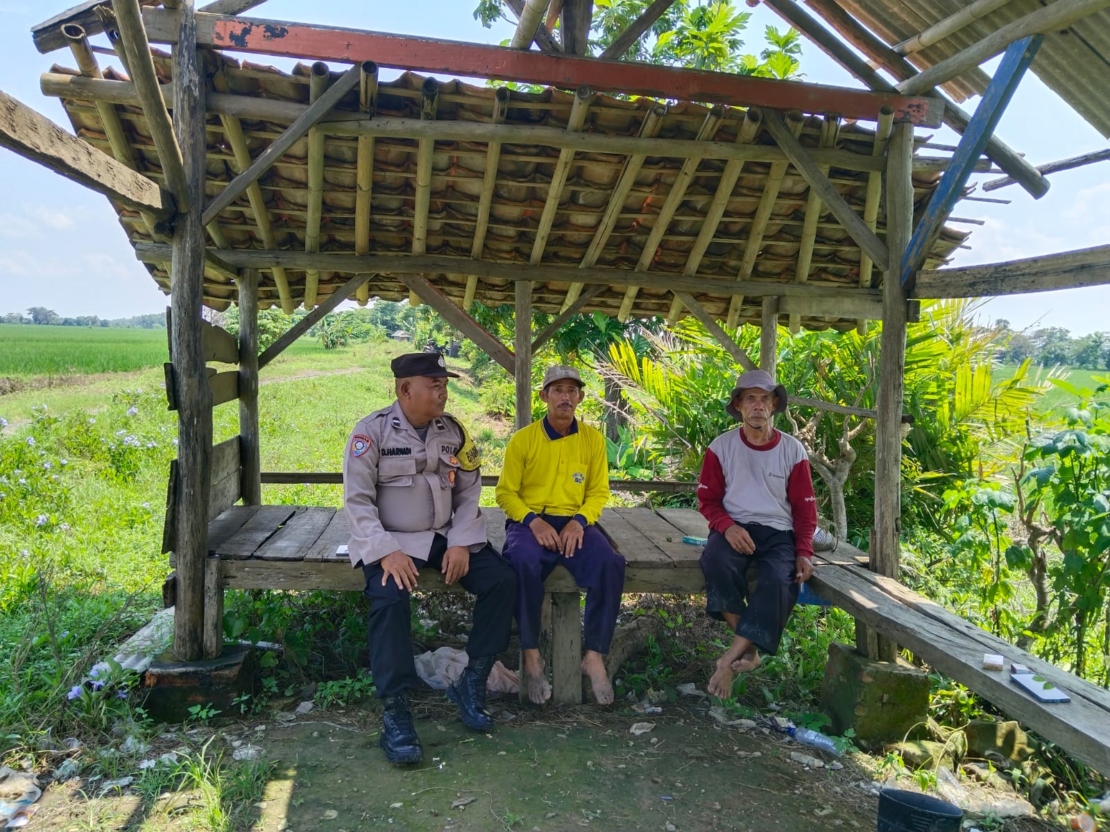 Majalengka – Aipda Didi Harnadi, Bhabinkamtibmas dari Polsek Dawuan Polres Majalengka Polda Jabar, melakukan kegiatan sambang kepada para petani di saung sawah Blok Langensari, Desa Genteng, Kecamatan Dawuan, Kabupaten Majalengka pada Sabtu (10/2024).