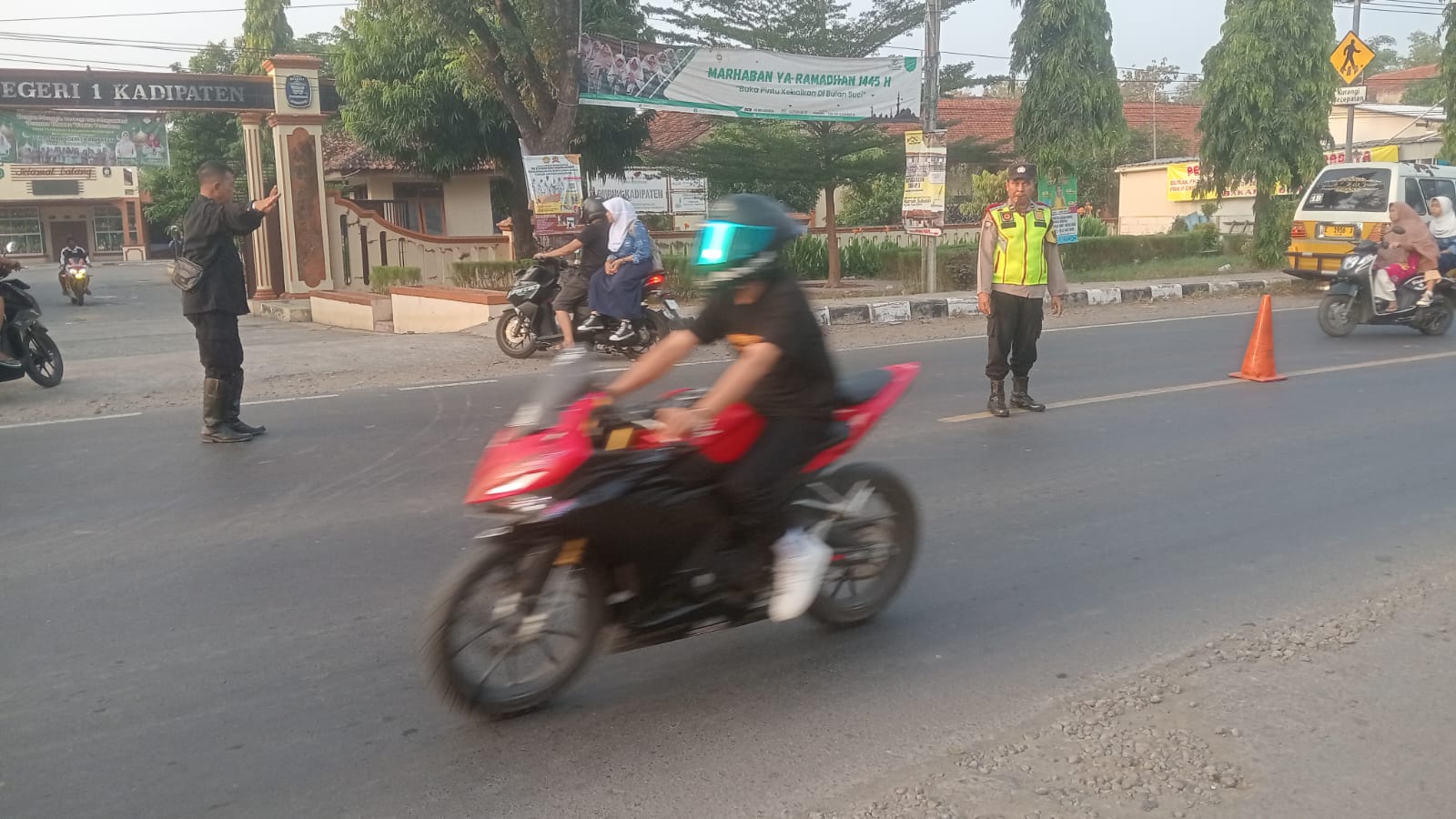 Majalengka,– Personel Polsek Kadipaten, Polres Majalengka, Polda Jabar, Aipda Mulani, melaksanakan kegiatan pengaturan lalu lintas pagi (gatur lalin pagi) di depan SMPN 1 Kadipaten, Kabupaten Majalengka. Kegiatan ini bertujuan untuk memberikan pelayanan prima kepada masyarakat, khususnya para siswa dan pejalan kaki yang menyeberang jalan menuju sekolah.Rabu (5/6/2024).