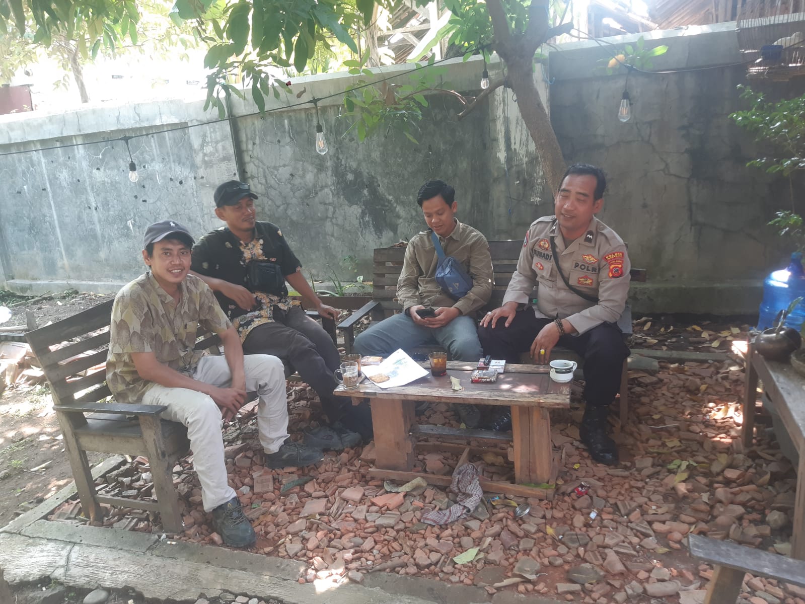 Dengan suasana penuh kehangatan di bawah rindangnya pepohonan, Aipda Sunadi terlihat akrab berdialog bersama sejumlah pemuda dan tokoh setempat.