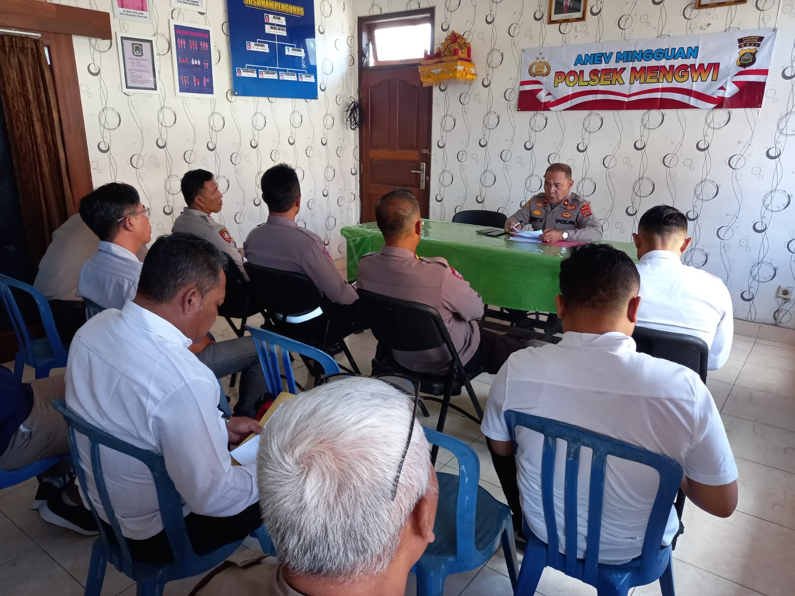 Kapolsek Mengwi Kompol I Ketut Adnyana T.J. S.Sos., S.H., M.H., melaksanakan analisa dan evaluasi (anev) perdana setelah sepekan menduduki Jabatan Kapolsek Mengwi, kegiatan dilaksanakan di aula Mako Polsek Mengwi Jalan I Gusti Ngurah Rai No. 110 Mengwi, Banjar Denkayu Delodan, Desa Werdi Bhuwana, Kecamatan Mengwi, Kabupaten Badung, Bali, Senin 10 Juli 2023 pukul 11.00 Wita.
