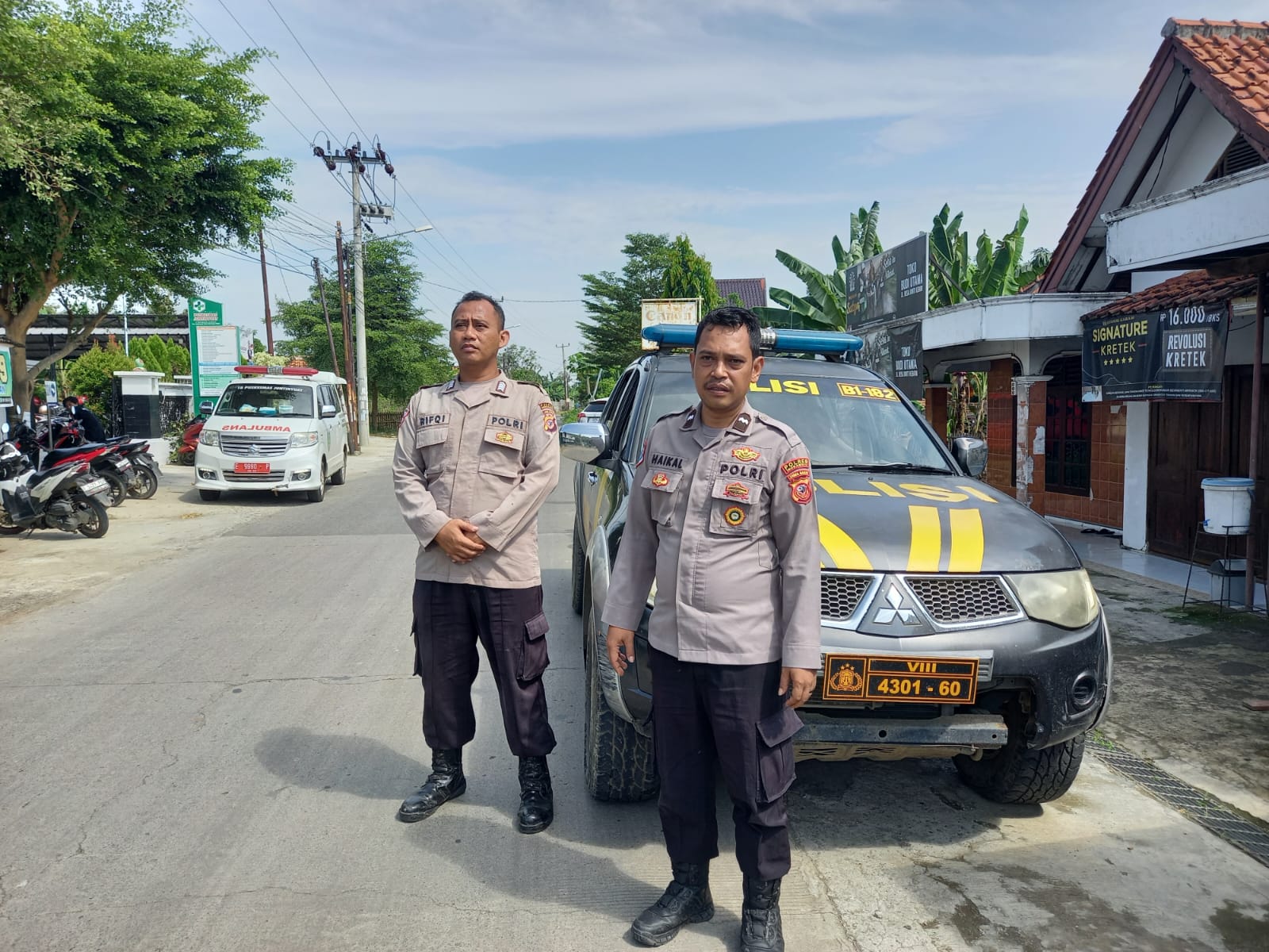 Indramayu – Dua anggota polisi berseragam tampak berdiri sigap di tepi jalan, dengan mobil patroli siaga di belakang mereka.