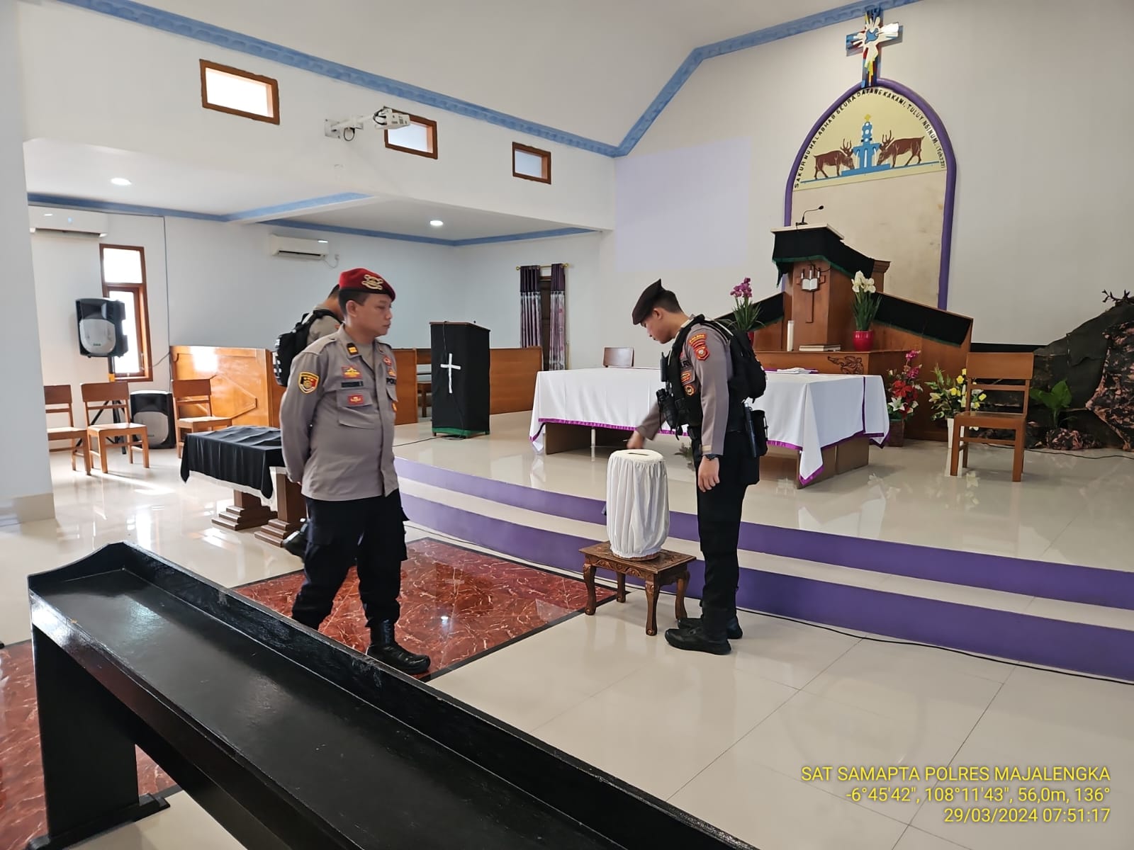 Majalengka – Dalam rangka memastikan keamanan dan kenyamanan bagi jemaat yang merayakan perayaan Paskah di Gereja Pasundan Jemaat Cideres, personel gabungan Polsek Kadipaten dan Polres Majalengka telah melaksanakan operasi sterilisasi dan pengamanan intensif di sekitar area gereja. Langkah ini diambil sebagai bentuk upaya preventif untuk mencegah gangguan keamanan dan memastikan perayaan ibadah berjalan lancar. Jumat (29/03/2024).