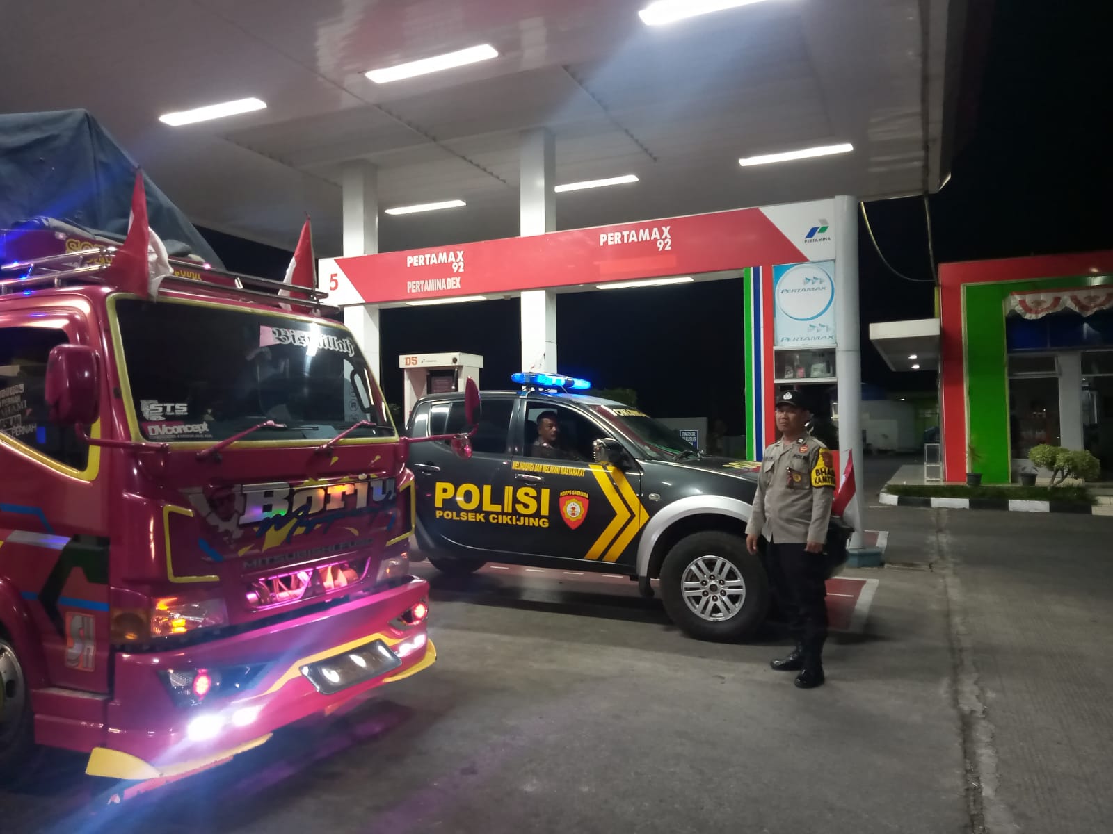 Majalengka – Personil Polsek Cikijing Polres Majalengka Polda Jabar, Ps. Panit Samapta lll Aiptu Agus Sri Wandono, S.H dan Bhabinkamtibmas Aiptu Usin melakukan Pengamanan dan monitoring di SPBU Cikijing Kabupaten Majalengka, Rabu (23/08/2023).