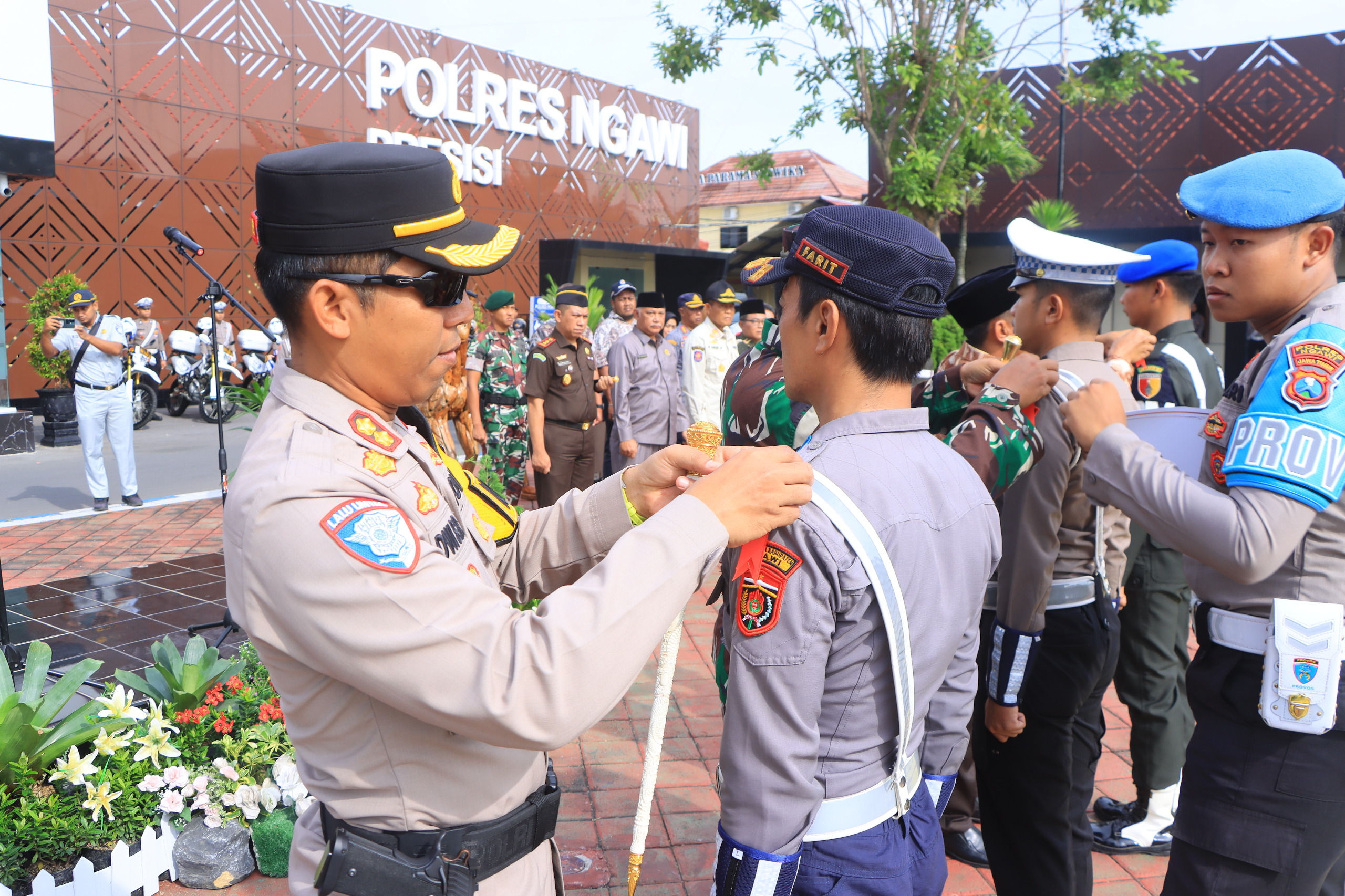 Dalam kesempatan tersebut, Pimpinan Apel menyematkan pita berwarna merah kepada perwakilan dari TNI, Polri dan Dinas Perhubungan Kabupaten Ngawi sebagai tanda dimulainya operasi Lilin Semeru 2024.