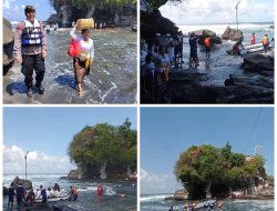 Pujawali Di Pura Luhur Tanah Lot Satuan Pol Airud Bantu dengan Rubber Boat Saat Air Laut Pasang