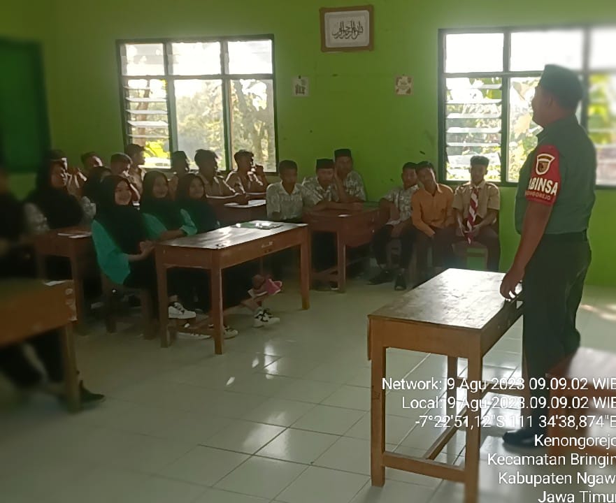 BUSERJATIM.COM GROUP-Ngawi – Bintara Pembina Desa (Babinsa) Koramil 0805/14 Bringin, Sertu Kholiq melaksanakan komsos dengan memberikan materi wawasan kebangsaan (Wasbang) kepada siswa/siswi di SMA Al Karomah, Bringin, Rabu (09/08/2023).