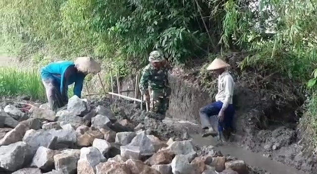 Babinsa Bersama Masyarakat Gotong Royong Bangun Irigasi Untuk Saluran Persawahan
