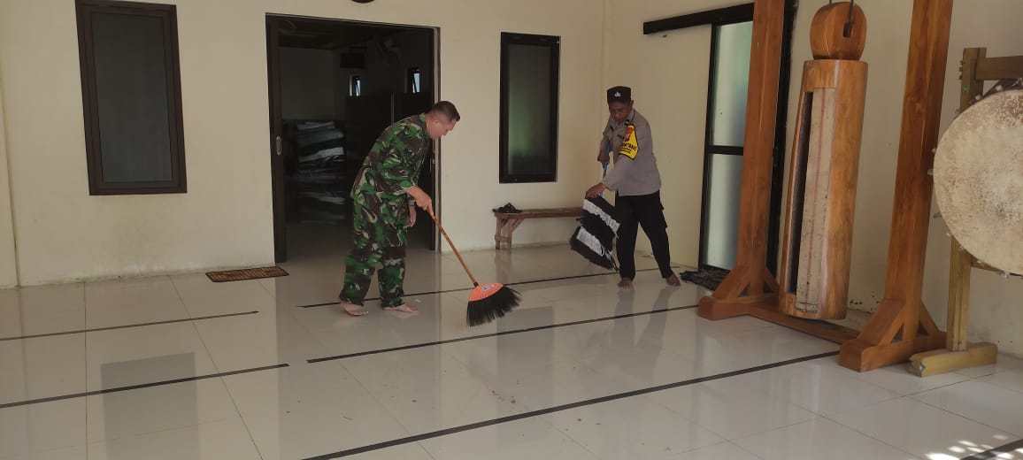 Babinsa dan Bhabinkamtibmas Desa Sidomulyo Lakukan Karya Bakti Pembersihan Masjid
