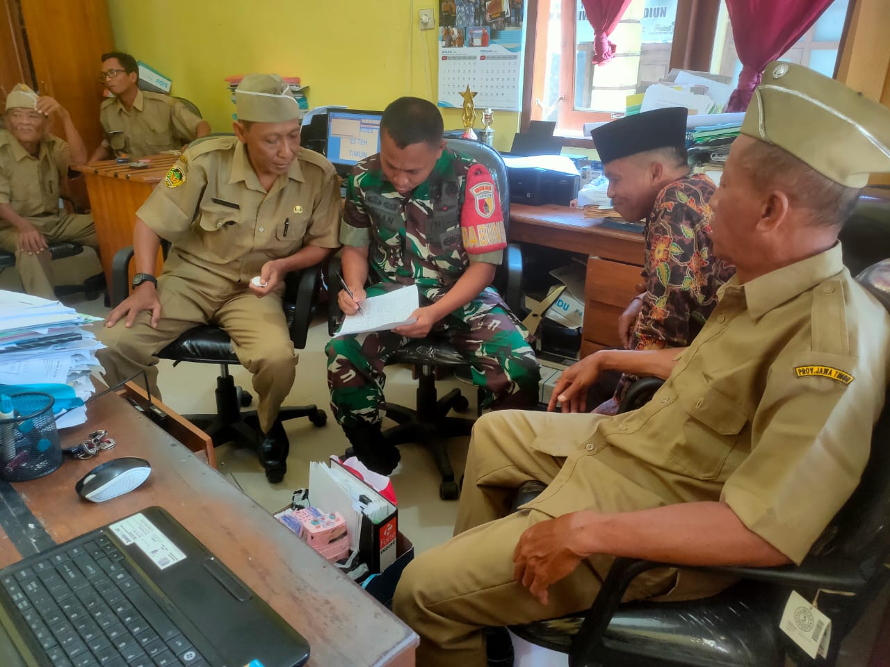 Madiun, – Pada hari ini, Jum’at 5 Juli 2024, Babinsa Desa Bibrik Koramil 0803/04 Jiwan Serka Tahan aktif terlibat dalam kegiatan Komunikasi Sosial (Komsos) yang konstruktif dengan Kepala Desa beserta perangkat desa. Pertemuan yang dilangsungkan di kantor desa ini bertujuan untuk membahas rencana pembangunan pengerasan jalan menuju area persawahan guna mempermudah pendistribusian hasil panen masyarakat setempat.