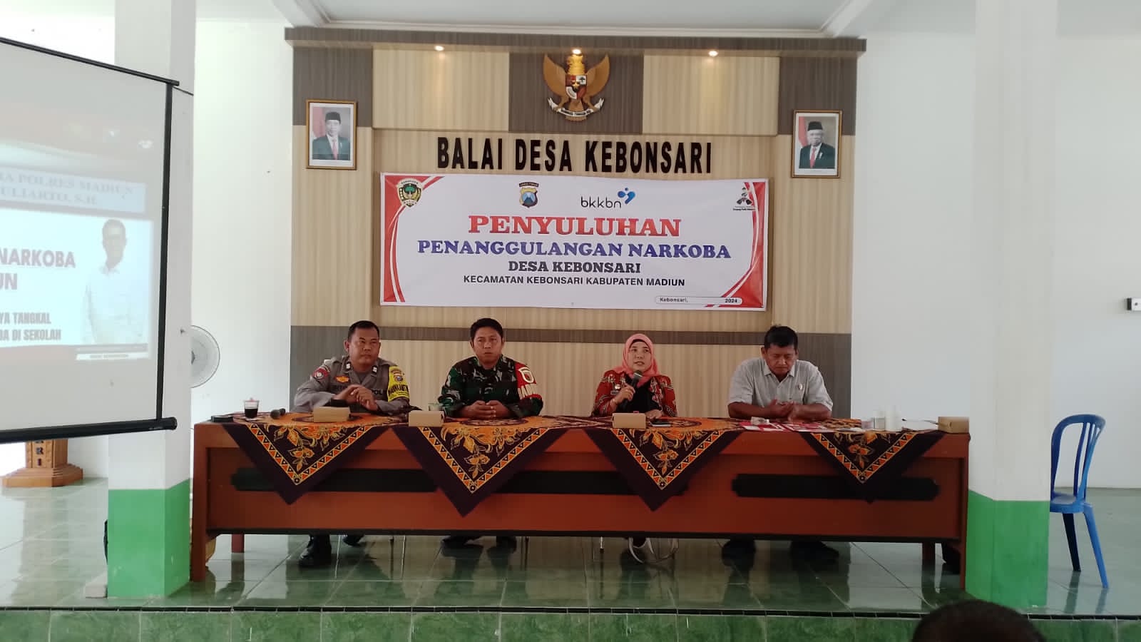 Madiun, – Babinsa Desa Kebonsari, Koramil 0803/13 Kebonsari, Serda Pujianto, bersama tiga pilar desa, yaitu Bhabinkamtibmas, Kepala Desa, dan Tokoh Masyarakat, menghadiri kegiatan penyuluhan tentang penanggulangan narkoba di Balai Desa Kebonsari, Kecamatan Kebonsari, Kabupaten Madiun. Jumat (26/4/2024).