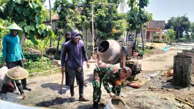Madiun, – Sertu Heri Pirwanto, Babinsa Desa Mojopurno Koramil 0803/05 Wungu, Kodim 0803 Madiun, turut mendampingi pelaksanaan pembangunan rabat beton jalan di Dusun Jatimangu RT 32 RW 03, Desa Mojopurno, Kecamatan Wungu, Kabupaten Madiun. Sabtu (4/5/2024).