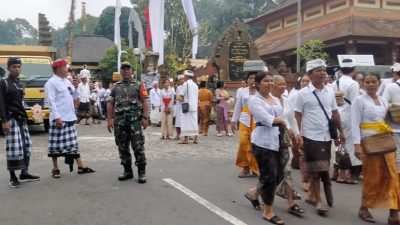 Anggota Kodim1619/Tabanan melalui Babinsa Desa Wongaya Gede Koramil 1619-08/Penebel Sertu I Gede Putu Suparta melaksanakan pengamanan sekaligus memantau pelaksanaan kegiatan upacara Pujawali Pura Luhur Batukau Desa Wongaya Gede Kecamatan Penebel Kabupaten Tabanan yang akan berlangsung selama 3 (Tiga) hari dari tanggal 3 s.d 6 Agustus 2023. Kamis (3/8/2023).