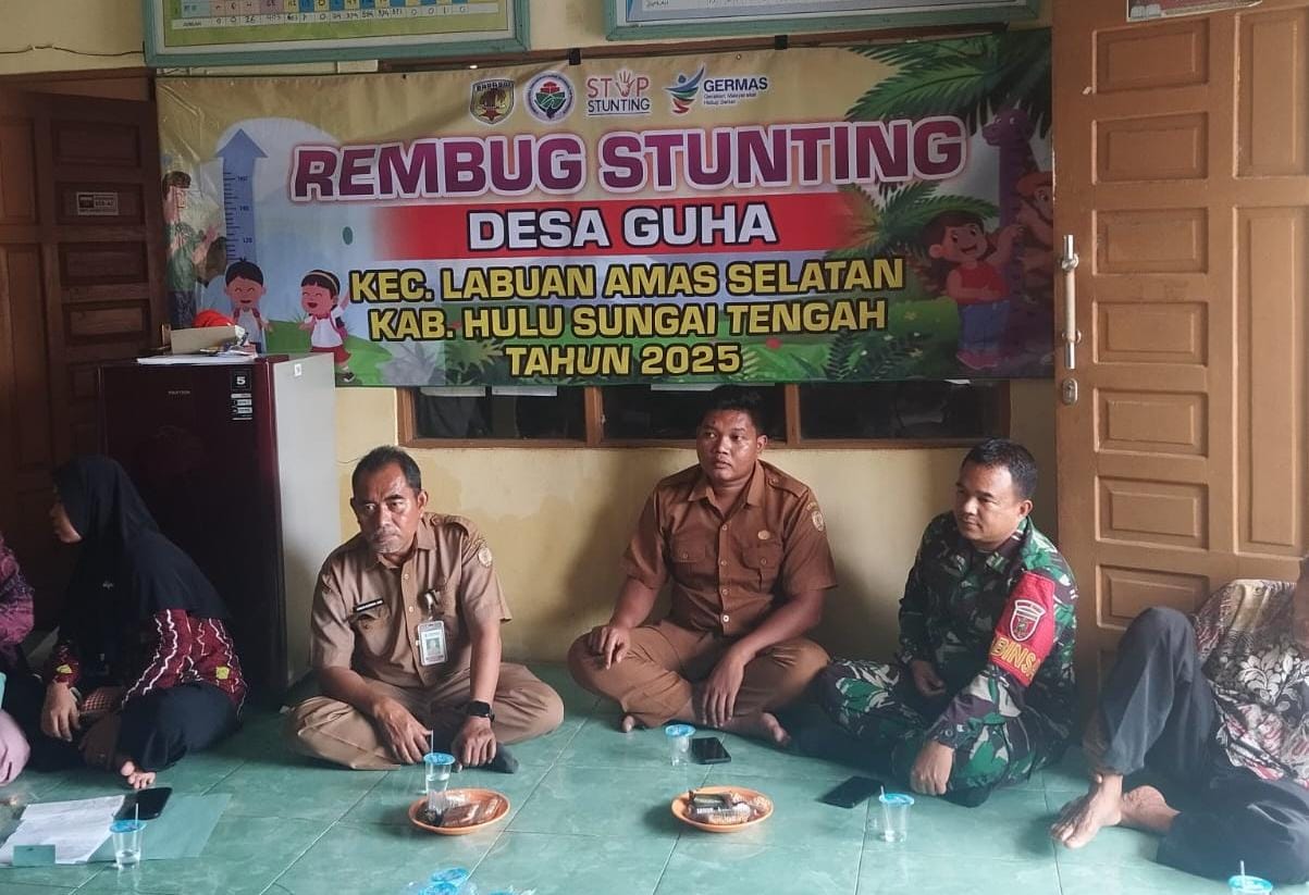 BARABAI, BUSERJATIM.COM –,Babinsa Koramil 1002-04/Labuan Amas Selatan Sertu Johan Arifin menghadiri kegiatan Rembuk Stunting dalam rangka upaya pencegahan dan penurunan angka stunting di desa Guha Kecamatan Labuan Amas Selatan Kabupaten Hulu Sungai Tengah. Rabu (25/06/2025).