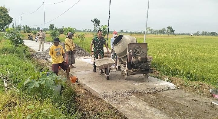 Babinsa Kaibon Bantu Masyarakat Rabat Jalan di Area Persawahan.
