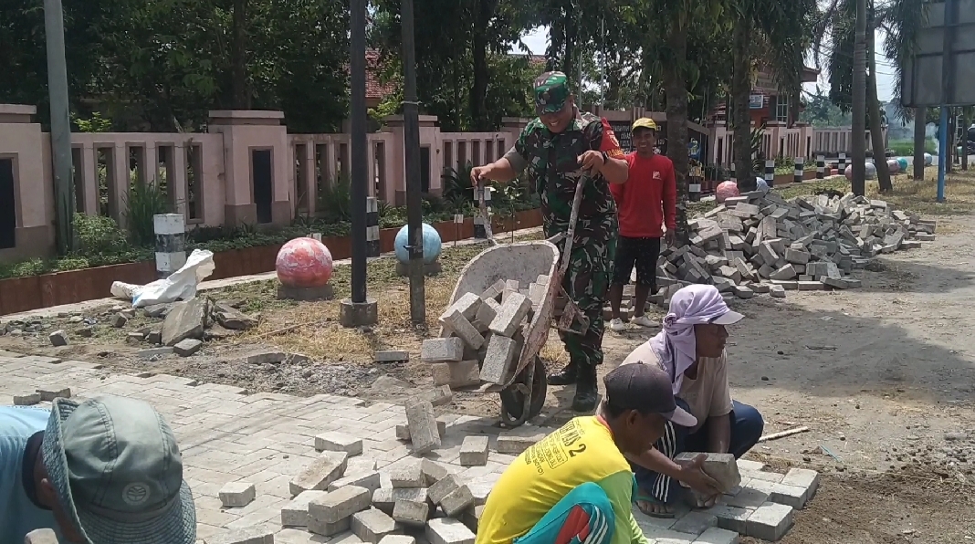 Madiun – Babinsa Koramil 10/Pilangkenceng Kodim 0803/Madiun Serma Nopia bersama masyarakat melaksanakan gotong-royong pemasangan paving di halaman Balai Desa Kenongorejo, Kec. Pilangkenceng, Kab. Madiun, Minggu (17/9/2023).