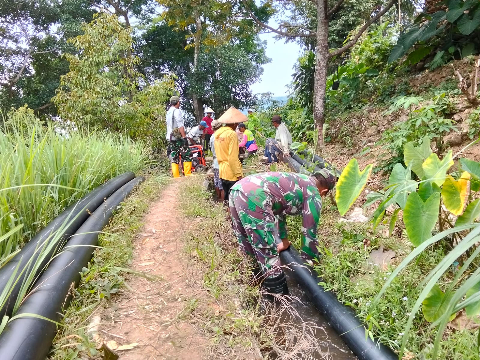 NGAWI, BUSERJATIM.COM GROUP  – Dalam rangka mendukung program TNI AD Manunggal Air, Sertu Marzuki, Babinsa Koramil 08/Jogorogo,Kodim 0805/Ngawi melaksanakan pendampingan kegiatan pipanisasi di Desa Jaten, Kecamatan Jogorogo, Kabupaten Ngawi. Minggu (19/10/2025).