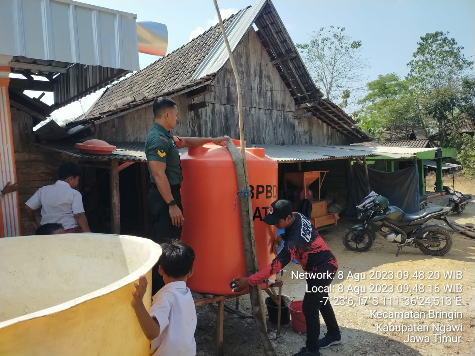Koramil Bringin Kodim 0805/Ngawi Sertu Suyanto turut serta membantu droping air bersih untuk warganya yang sudah menyiapkan tempat air maupun jerigen untuk mendapatkan air tersebut. Selasa (08/08/2023)