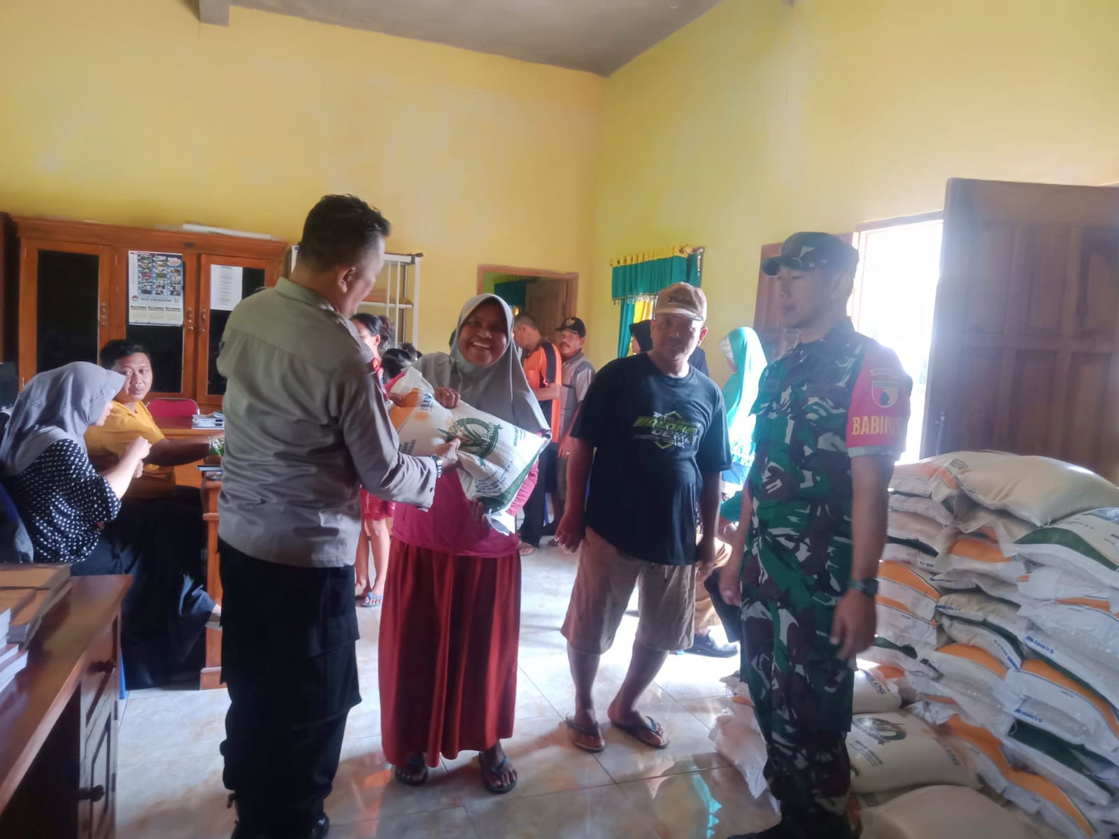 Babinsa Serda Egi mengatakan bahwa sebagai seorang Babinsa dirinya melaksanakan pengamanan pembagian bantuan beras yang berasal dari Bulog.