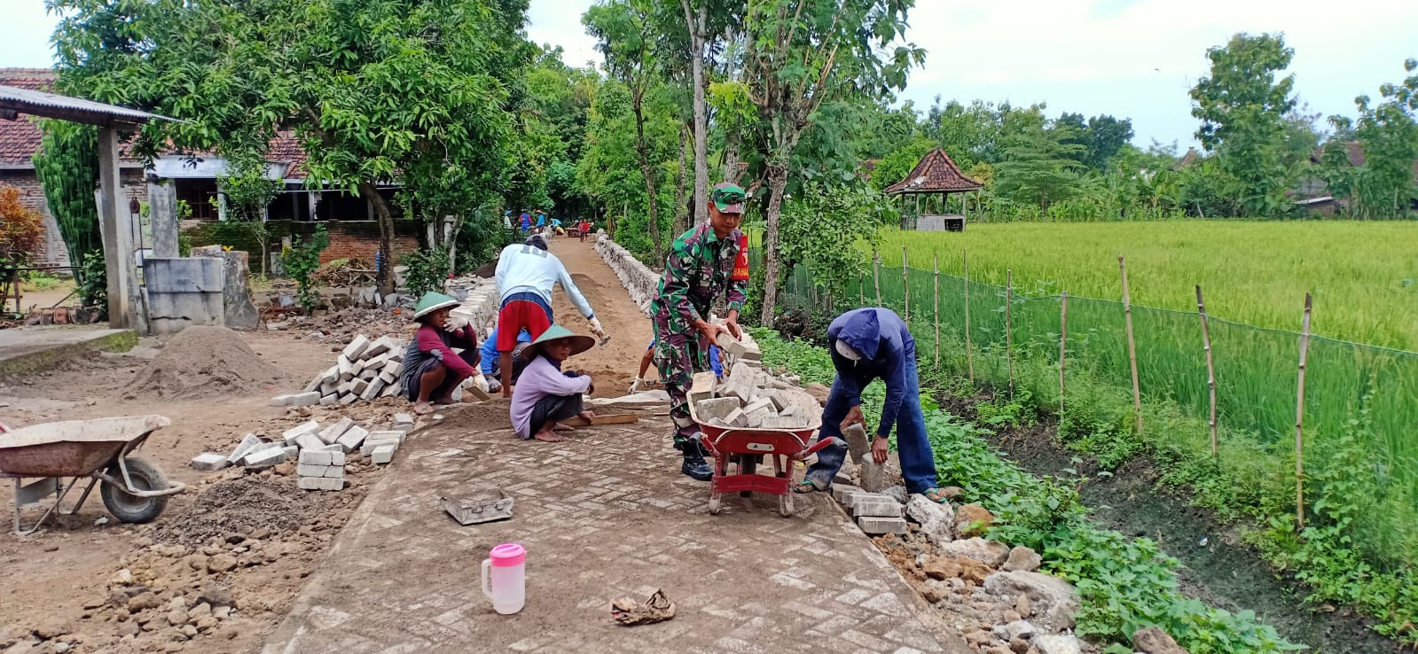 Babinsa Koramil Pilangkenceng Bantu Warga Pasang Paving Jalan Desa.