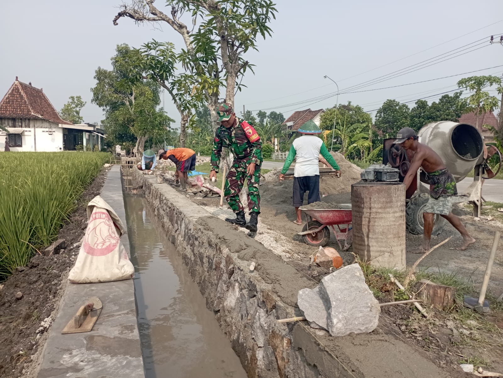 Babinsa Koramil Pilangkenceng Ikut Kerja Bakti Pembuatan Talut Saluran Irigasi di Desa Dawuhan.