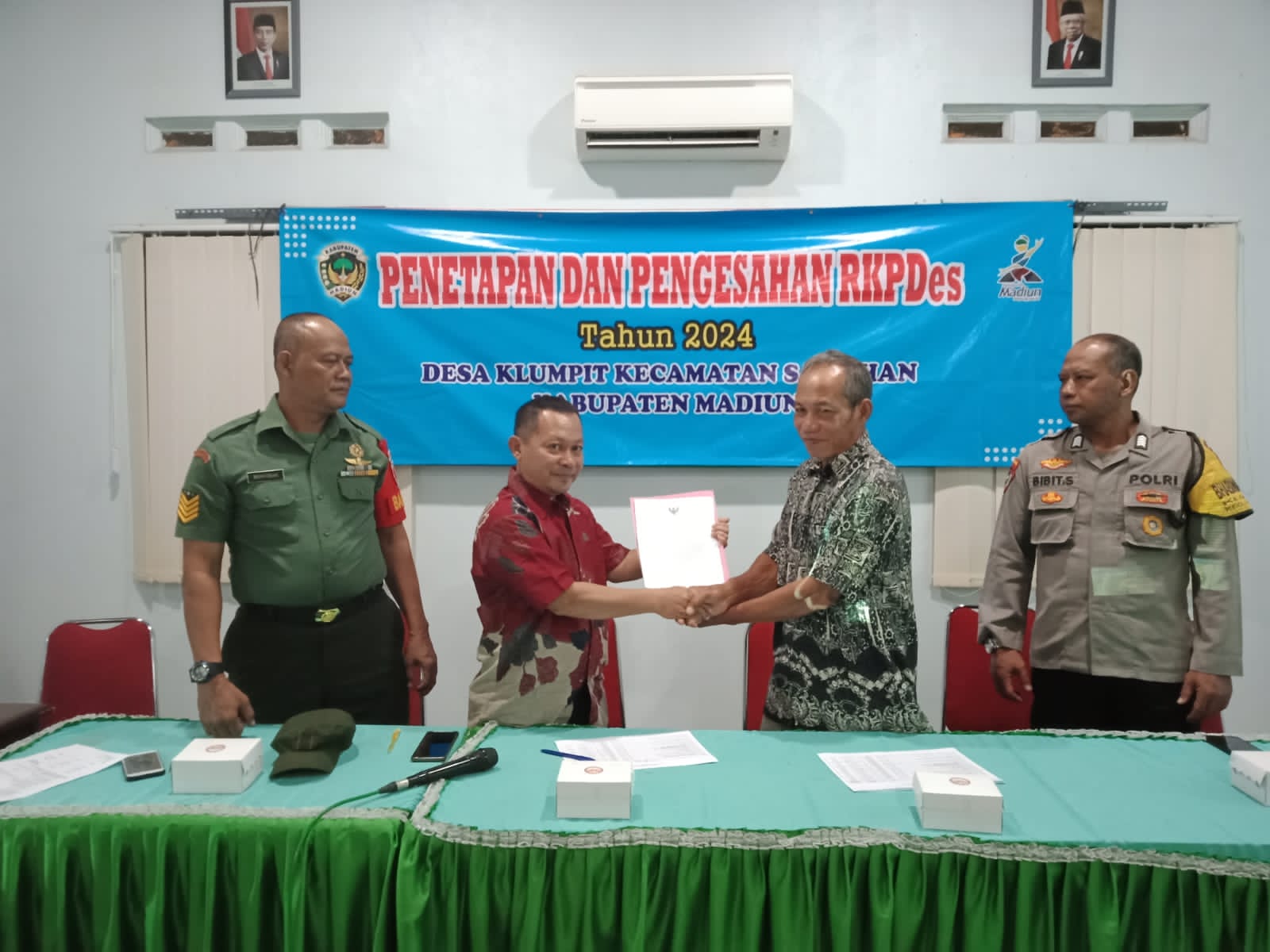 Madiun – Babinsa Desa Klumpit, Koramil 17/Sawahan, Kodim 0803/Madiun, Serma Markoban menghadiri penetapan dan pengesahan Rencana Kerja Pemerintah Desa (RKPDes) yang dilaksanakan di Gedung PKK Desa Klumpit, Kecamatan Sawahan, Kabupaten Madiun, Jumat (6/10/2023).