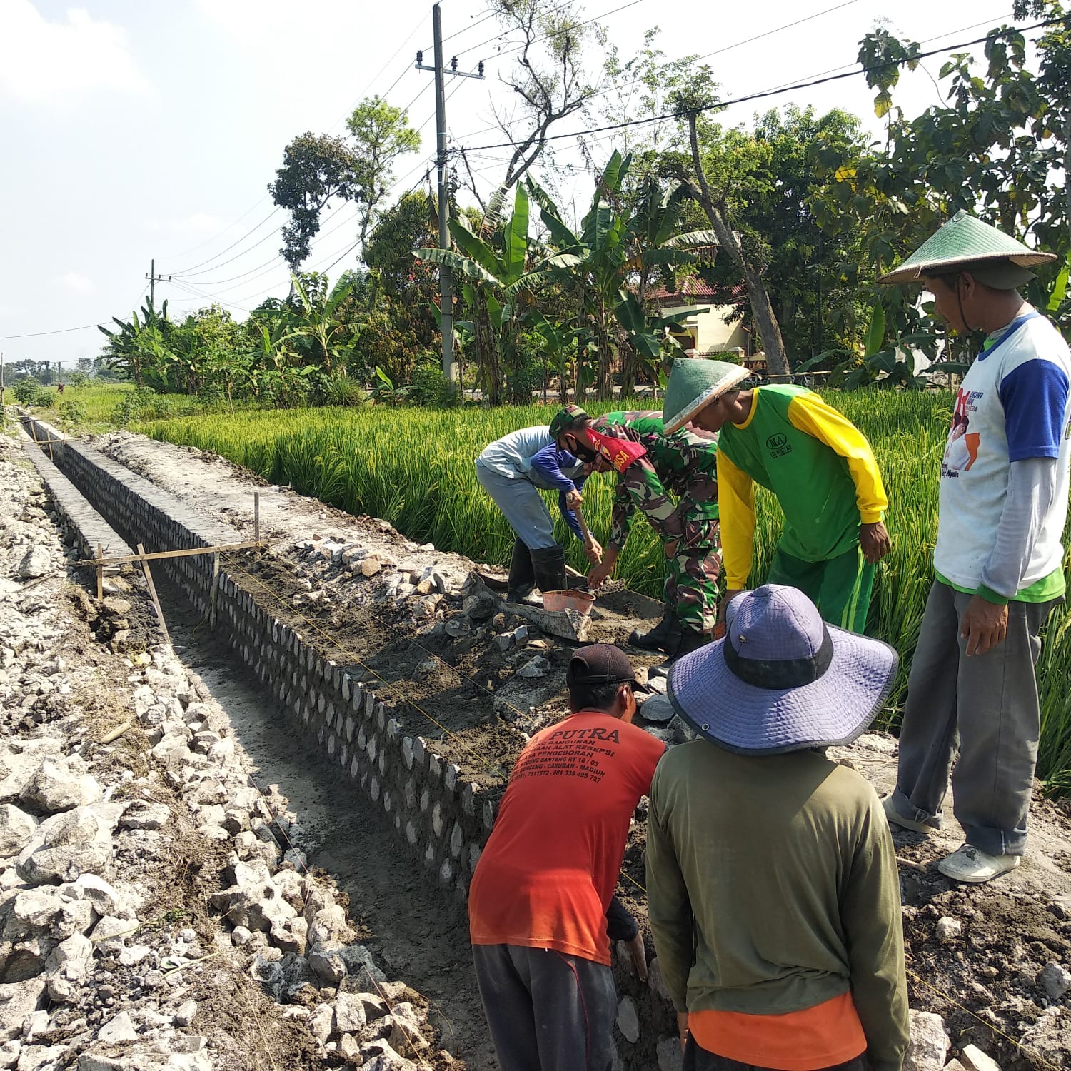 Selama pekerjaan berlangsung terlihat Babinsa dan warga saling bahu-membahu dalam membangun saluran irigasi. Di sela-sela kesibukannya mereka saling bercanda mencerminkan keakraban dan kemanunggalan antara TNI dengan Rakyat.