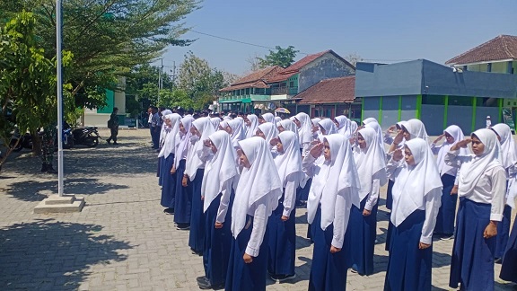 Magetan.buserjatim.com-Babinsa desa Mojopurno Posramil Ngariboyo Koramil 0804/01 Magetan Kodim 0804/Magetan Serma Sukadi bersama 2 orang Babinsa memberikan materi Wawasan kebangsawanan Dan PBB di MTS Yayasan Maarif Desa Mojopurno bertempat di Yayasan Al Maarif Desa Mojopurno Kecamatan Ngariboyo Kabupaten Magetan. Senin (9/10/2023)