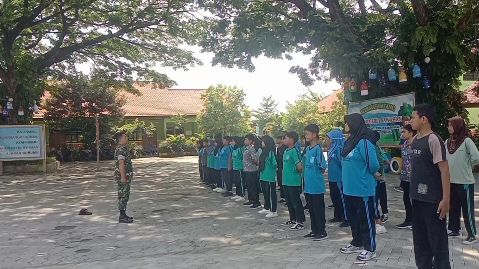 Madiun, 19 November 2024 – Sertu Eko Susanto, Babinsa Desa Pucangrejo dari Koramil 0803/17 Sawahan, memberikan pelatihan kepada siswa-siswi kelas VII dan VIII SMPN 1 Sawahan dalam kegiatan Latihan Dasar Kepemimpinan (LDK) yang berlangsung di halaman sekolah. Dalam kesempatan tersebut, Sertu Eko menyampaikan materi penting tentang Peraturan Baris-Berbaris (PBB) dan wawasan kebangsaan sebagai bagian dari pembentukan karakter kepemimpinan bagi generasi muda. Kegiatan ini diikuti oleh lebih dari 100 siswa dan bertujuan untuk menanamkan disiplin serta rasa cinta tanah air.