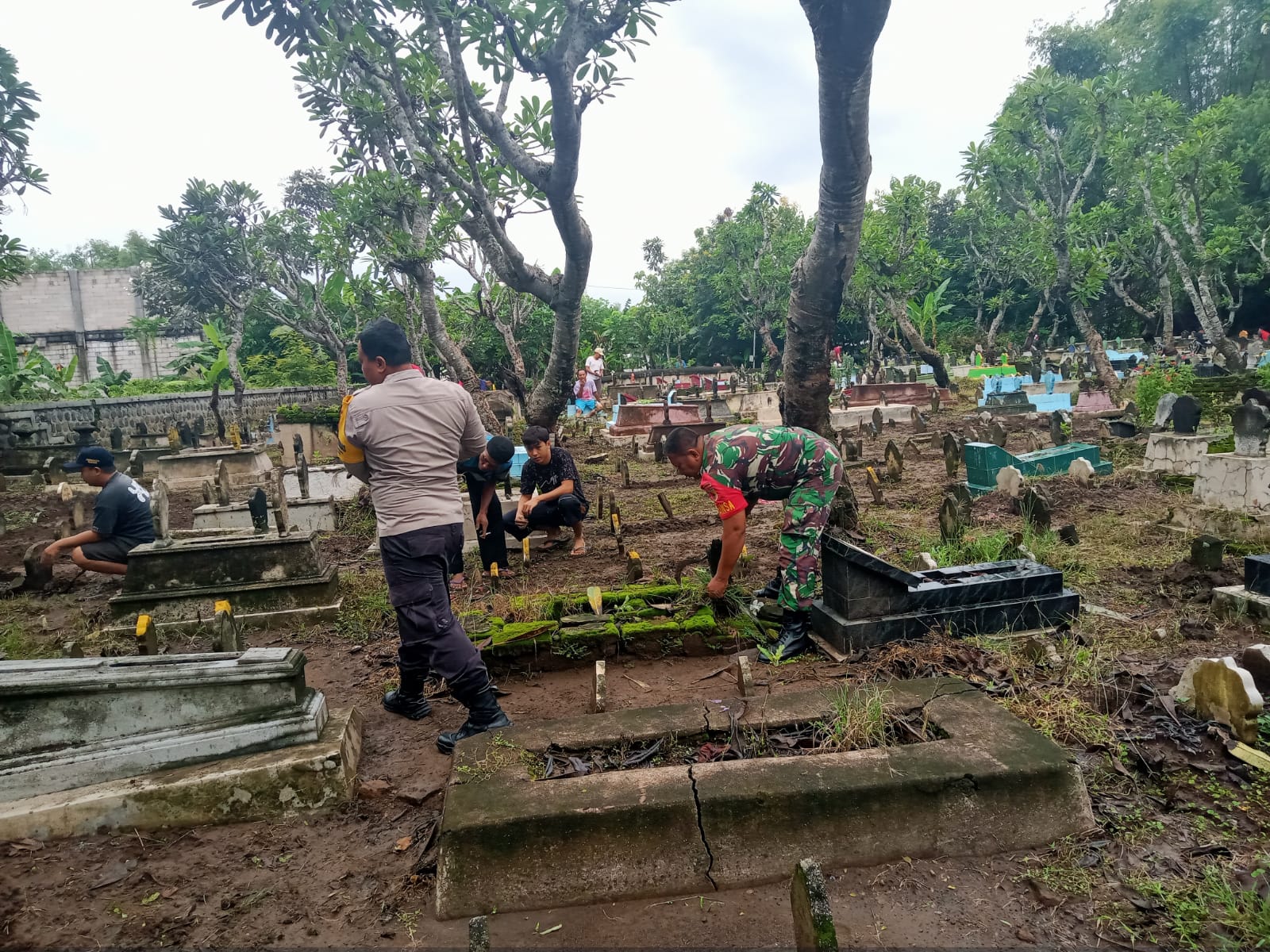 Madiun – Personil Babinsa Koramil 0803-05/Wungu, Sertu Suwarno bersama warga masyarakat melaksanakan gotong royong membersihkan pemakaman umum di Desa Tempursari, Kecamatan Wungu, Kabupaten Madiun, Kamis (14/3/2024).