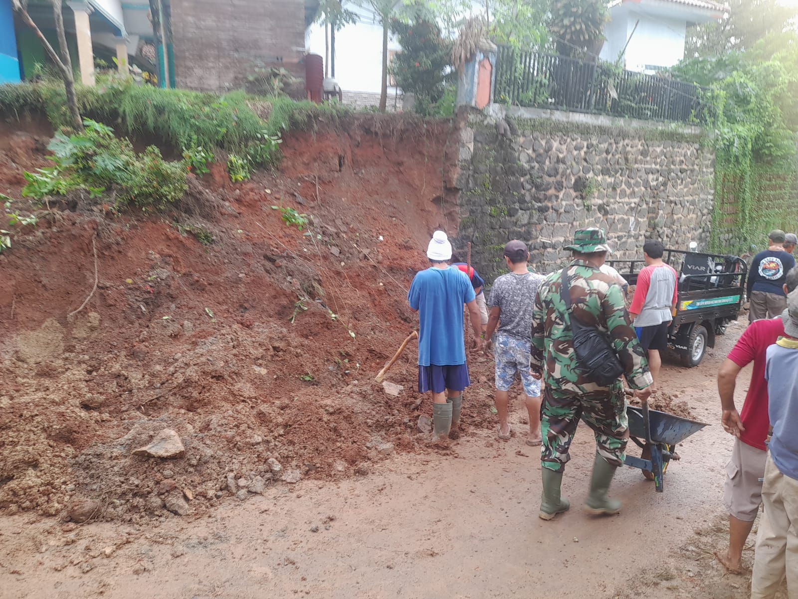 Majalengka || Bencana alam longsornya senderan tanah depan rumah warga di Blok Cikeusik Tonggoh RT 02 RW 03 Desa Cikeusik, Kecamatan Sukahaji, Kabupaten Majalengka mengakibatkan akses jalan desa tertutup mulai dibersihkan tim gabungan.