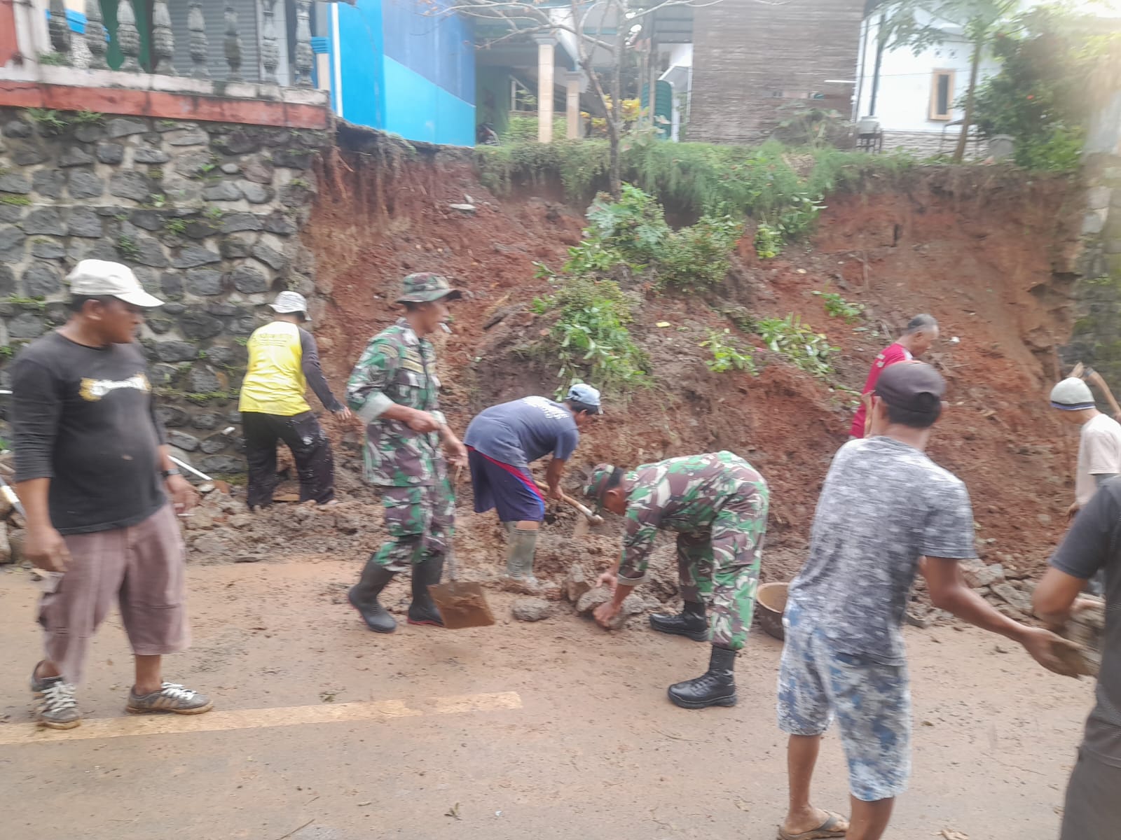 Terkait hal itu, Danramil 1708 Sukahaji Kapten Inf Aceng Junandi bergerak cepat dengan menerjunkan personel ke lapangan untuk membersihkan longsoran tanah agar aktifitas masyarakat kembali normal.