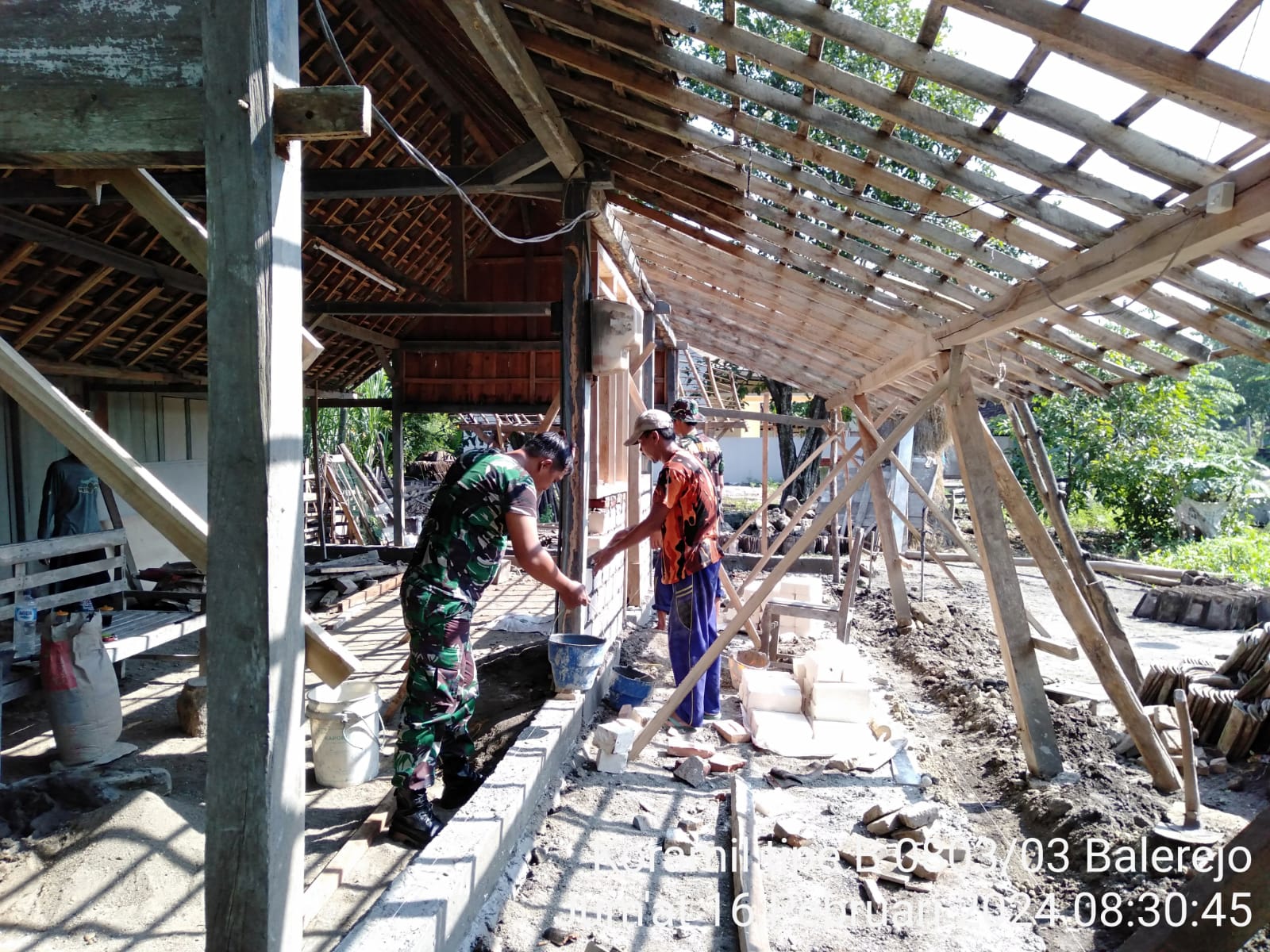 Madiun – Guna mewujudkan sinergitas TNI bersama rakyat, Babinsa Koramil 03/Balerejo Kodim 0803/Madiun, Serma Usman Gunadi melaksanakan karya bakti membantu renovasi rumah milik ibu Sarmi warga Desa Warurejo, Kecamatan Balerejo, Kabupaten Madiun, Minggu (18/2/2024).