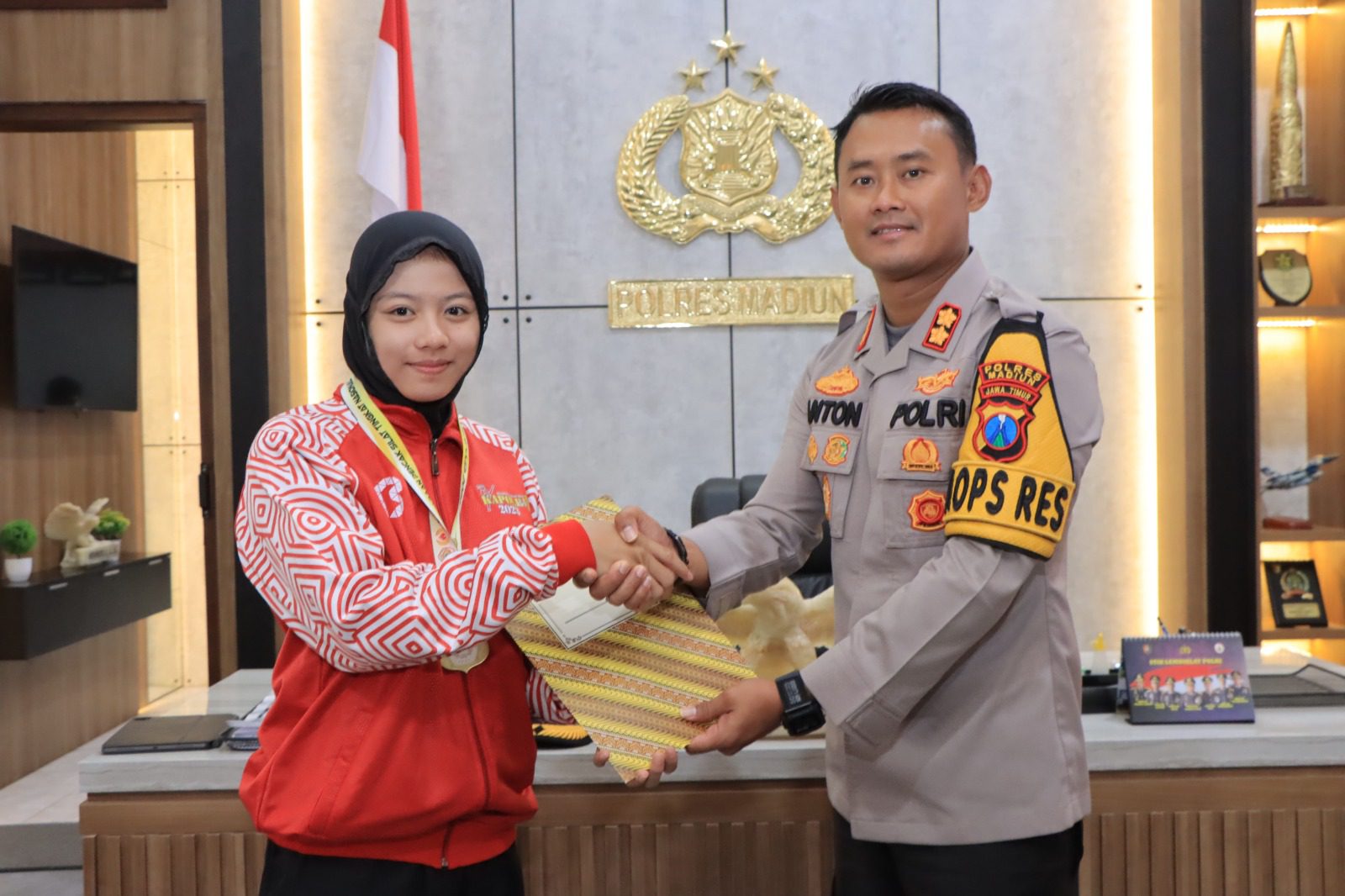 Terkait hal itu Kapolres Madiun, AKBP Anton Prasetyo memberikan langsung penghargaan kepada Nadia yang didampingi oleh pelatih dan Muspika Kecamatan Dolopo di ruang kerja Kapolres, Senin (27/3/2023).