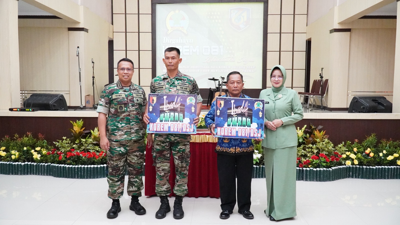 “Selamat pak Sugeng, disyukuri, ini rezeki dari Allah. Siapkan diri untuk melaksanakan ibadah ke tanah suci,” kata Rama saat menyerahkan secara simbolis tiket umrah gratis pada acara syukuran HUT ke-61 Korem 081/DSJ di Aula Jenderal Sudirman Makorem, Kota Madiun, Jumat (29/11/2024). Tak hanya satu, umrah gratis juga diberikan kepada Sertu Rokhim.
