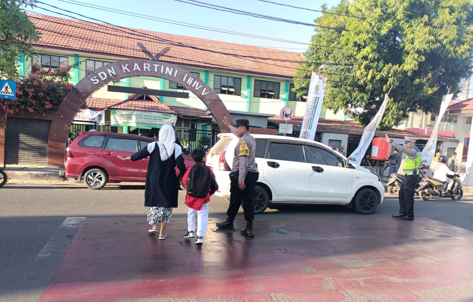 POLRES CIREBON KOTA. Bentuk Kehadiran Polri di tengah masyarakat Bhabinkamtibmas Kelurahan Kejaksan Bripka Pendy membantu Siswa SDN Kartini menyebrang Jalan, Kamis (20/07/2023) Pagi.