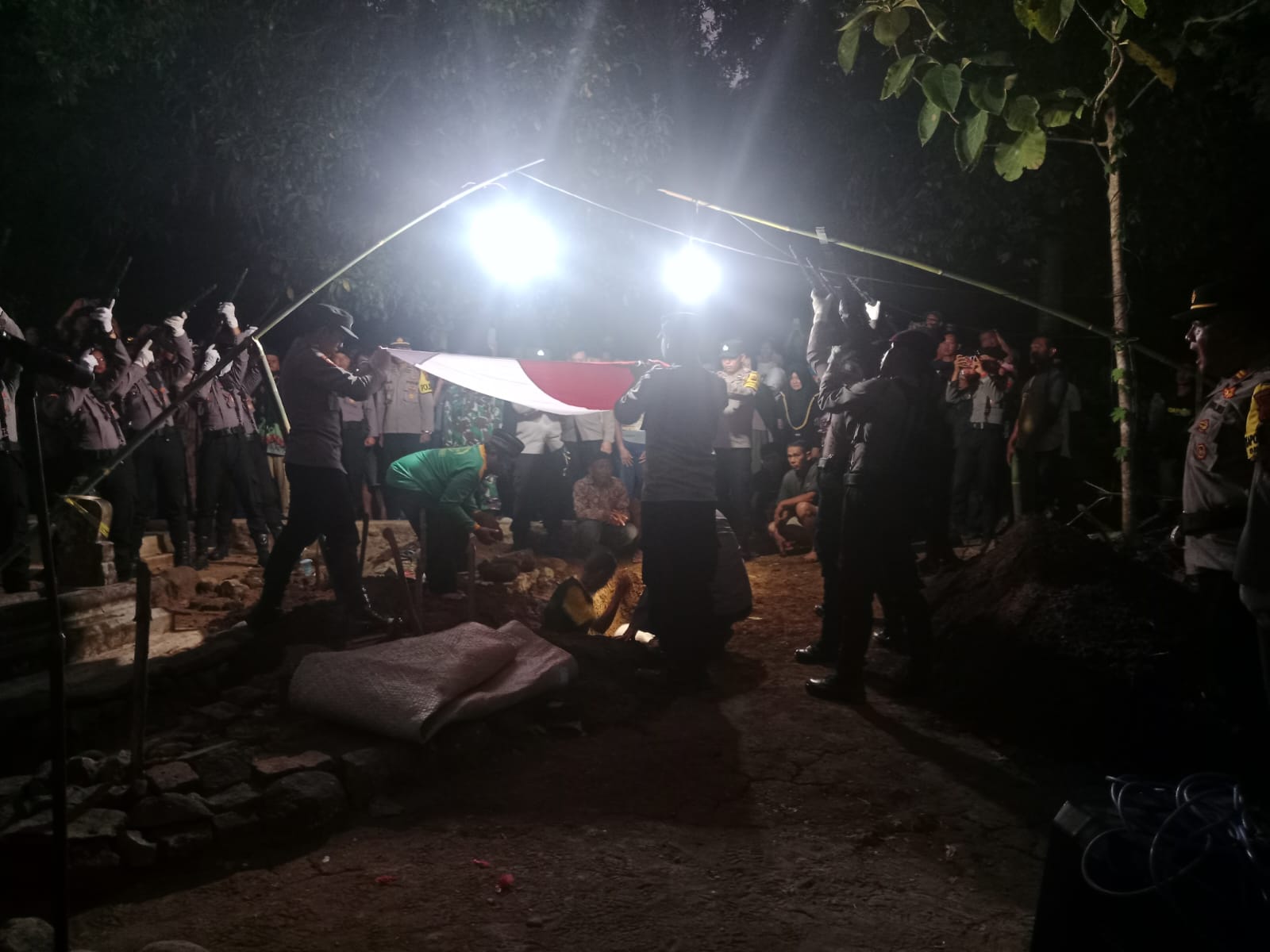 Upacara pemakaman digelar di Desa Cikeusik Kecamatan Sukahaji Kabupaten Majalengka sebagai bentuk penghormatan terakhir dan penghargaan kepolisian atas jasa dan pengabdian selama di kepolisian. Selasa (15/08/2023) sore.