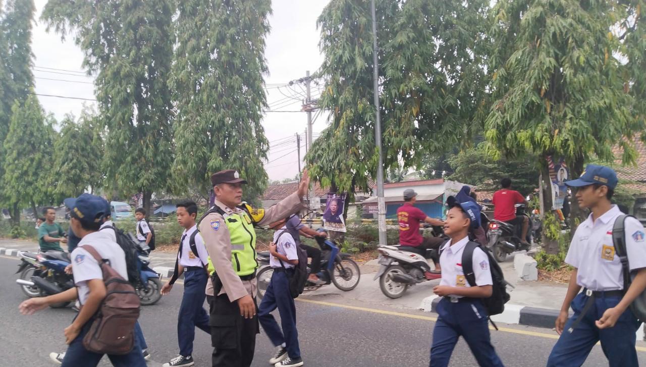 Berikan rasa aman, personil Polsek Gunungjati Ciko sebrang kan siswa saat Gatur pagi