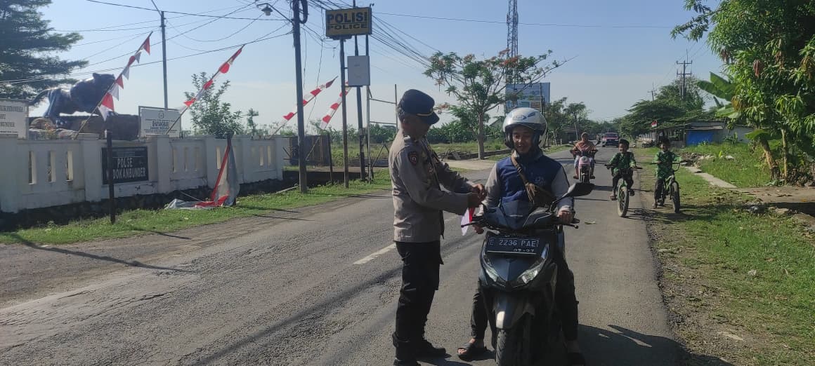 Satu per satu pengendara yang melintas diberhentikan secara santun, lalu dipasangi bendera merah putih di kendaraannya.