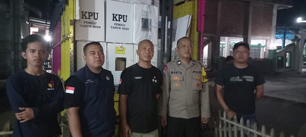 Bhabinkamtbmas kelurahan kebon baru Polsek Utbar Polres Cirebon kota Polda Jabar Bripka Dede Suhendar monitoring gudang logistik PPK Pemilu 2024 di Kecamatan Kejaksan Kamis malam (15/02/2024)