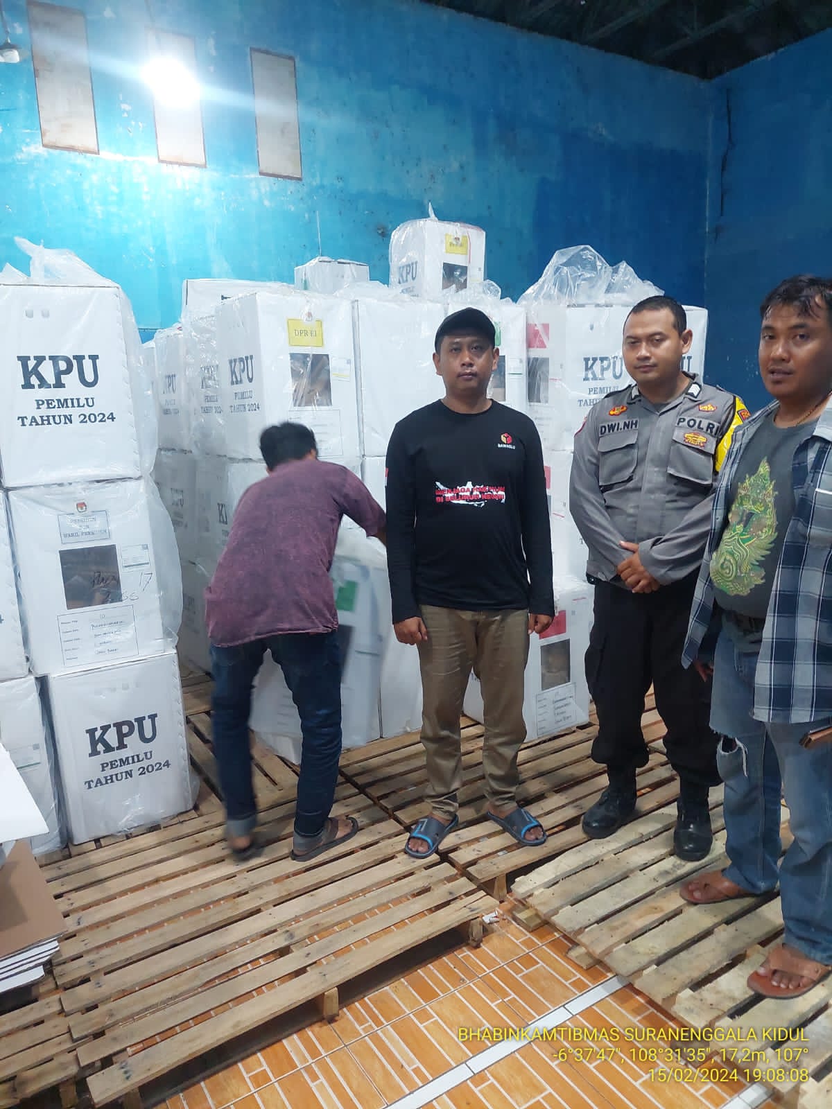 Bhabinkamtbmas Desa Suranenggala Polsek Kapetakan Polres Cirebon kota Polda Jabar Bripka warsidi monitoring pergeseran kotak suara Pemilu 2024 di PPS desa Suranenggala ke PPK, Kamis malam (15/02/2024)