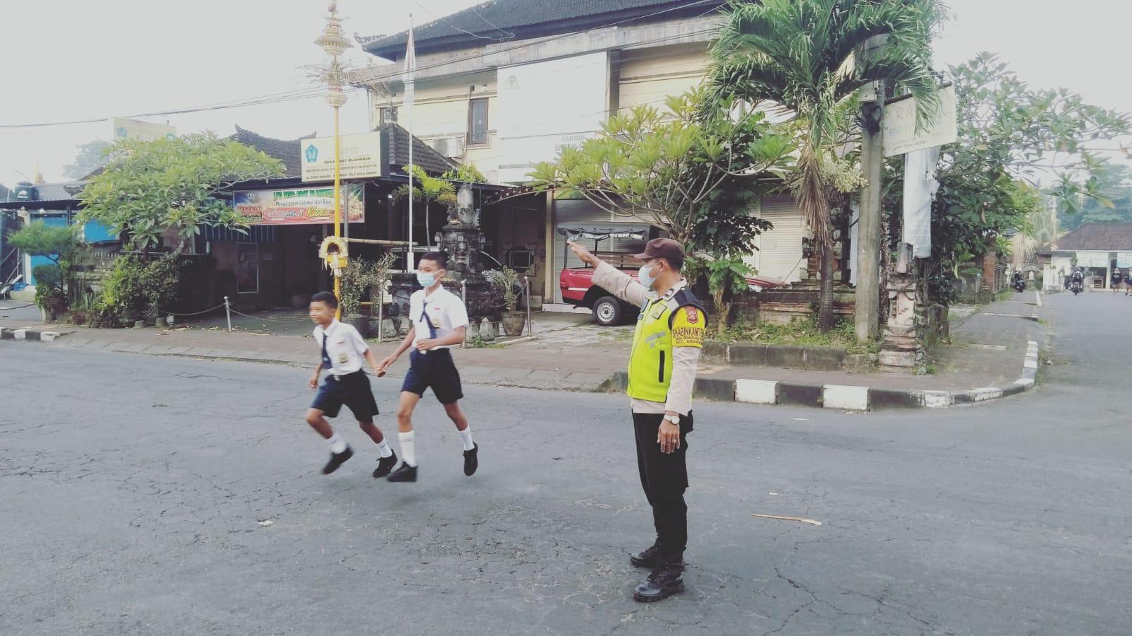 Ketika melaksanakan PH pagi di depan kantor camat Abiansemal, Rabu (25/01/2023), melihat anak-anak sekolah yang akan menyebrang jalan, Pak Bhabin ini dengan sigap menolong anak-anak menyeberangkan jalan.