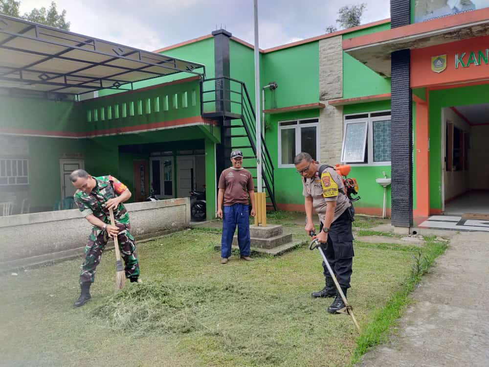 Polres Bogor – Menjaga Silaturahmi dan Sinergi Polisi, Aiptu Urip Nurbowo Bhabinkamtibmas dan Babinsa Desa Kotabatu Sertu Toga Hutagalung melaksanakan kegiatan membersihkan halaman kantor Desa Kotabatu yang sudah waktunya untuk di bersihkan, 06/07/23.