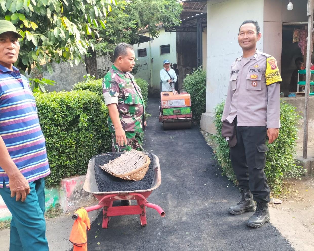 POLRES CIREBON KOTA,-Dalam upaya menjaga harkamtibmas di wilayah desa binaanya, Bhabinkamtibmas Desa Battembat Polsek Kedawung Polres Cirebon Kota Bripka Indrawijaya bersinergi dengan Babinsa Sertu Joko, monitoring dan pantau kegiatan perbaikan dan pengaspalan jalan gang desa sekaligus berikan himbauan kamtibmas.