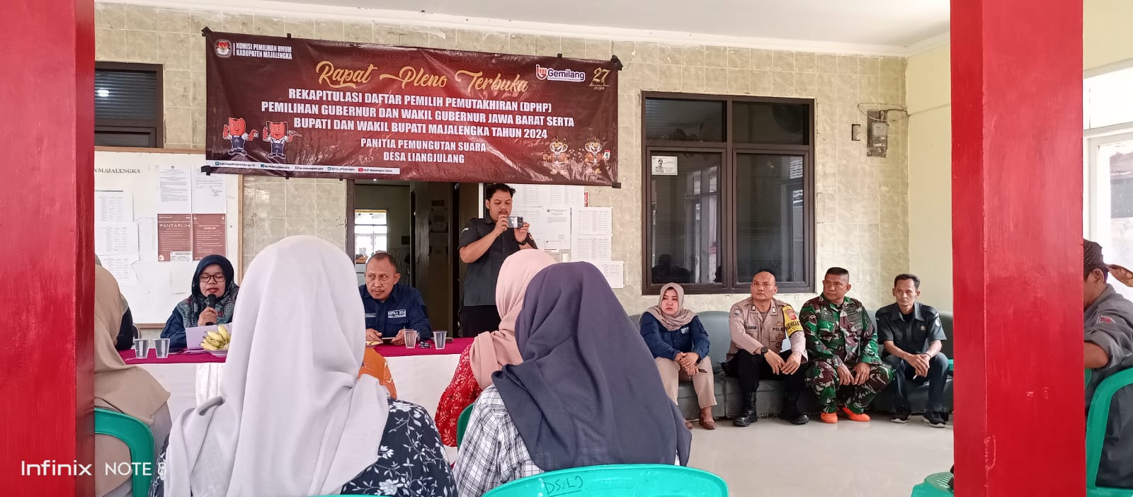 Majalengka – Bhabinkamtibmas Desa Liangjulang, Bripka Mochamad Atin Ramdhan, S.H., yang merupaka personel Polsek Kadipaten Polres Majalengka Polda Jabar, bersama Babinsa Desa Liangjulang, Sertu Sabarudin Lubis, dari Koramil 1717 Kadipaten, menghadiri Rapat Pleno Terbuka Rekapitulasi Daftar Pemilih Hasil Pemuktahiran (DPHP) untuk Pemilihan Kepala Daerah Serentak 2024 tingkat PPS Desa Liangjulang, Kecamatan Kadipaten. Minggu (04/08/2024).