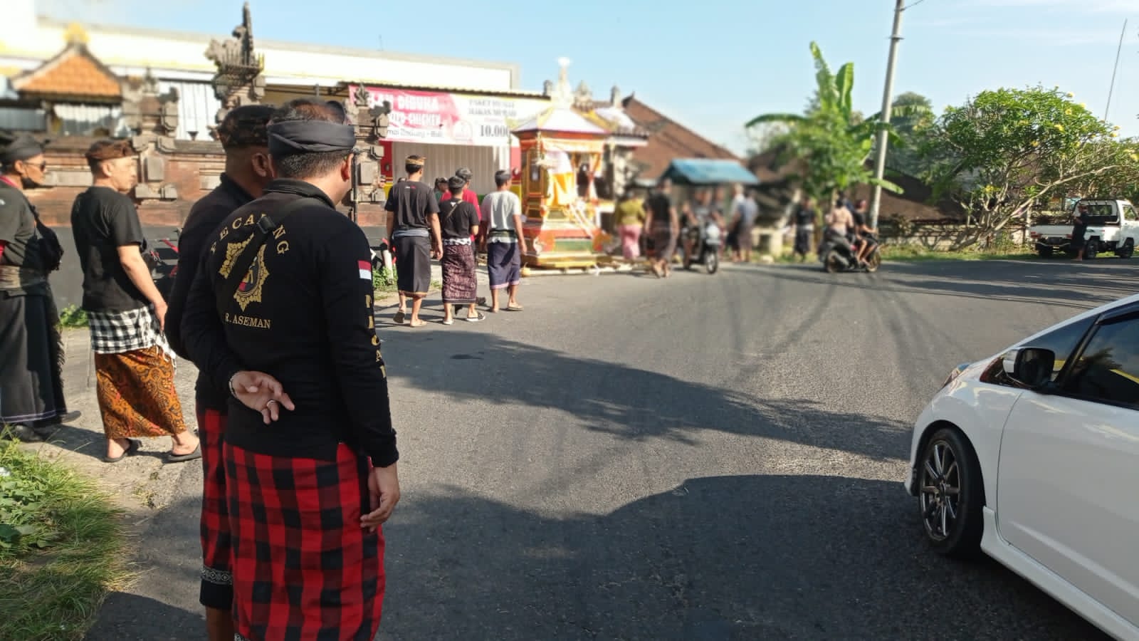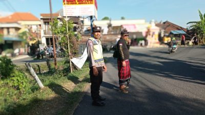 Pada hari Kamis (15/04/23) pukul 10.15 wita Bhabinkamtibmas Desa Abiansemal Aiptu I Made Sutama berkolaborasi dengan Pecalang melaksanakan pengamanan arus lalu lintas iring-iringan kegiatan upacara pengabenan alm. Ni Made Raji 55 th, warga banjar Aseman, desa Abiansemal.