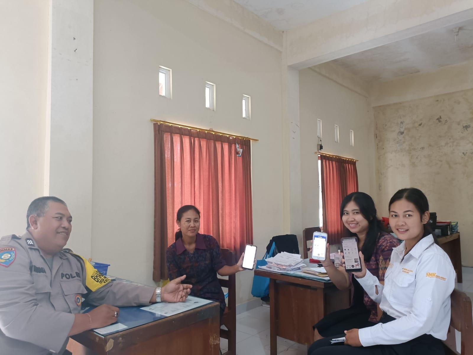 Bhabinkamtibmas Desa Adyc Aiptu Nyoman Sutrinayasa, melaksanakan sosialisasi aplikasi  Polri SUPER  App terhadap seorang guru matematika Luh Putu Sinta Pramesti (25) di ruang sekolah SMK Pandawa Bali Global yang ada di wilayahnya di Desa Yeh Cani, Kecamatan Abiansemal, Kabupaten Badung. Selasa, (7/2) pagi.