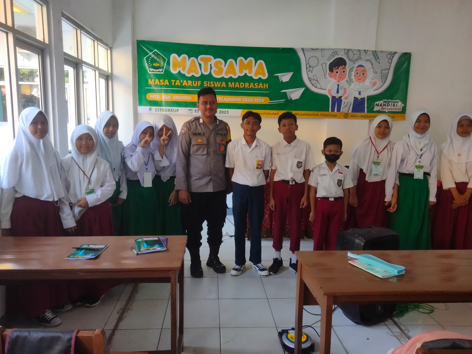 Citeureup – Polres Bogor, Bhabinkamtibmas Desa Citeureup Polsek Citeureup Polres Bogor Polda Jabar Bripka Deni Sutrisna melaksanakan kegiatan Penyuluhan kepada SMP As Shoheh saat MPLS kemarin (19/07/23),