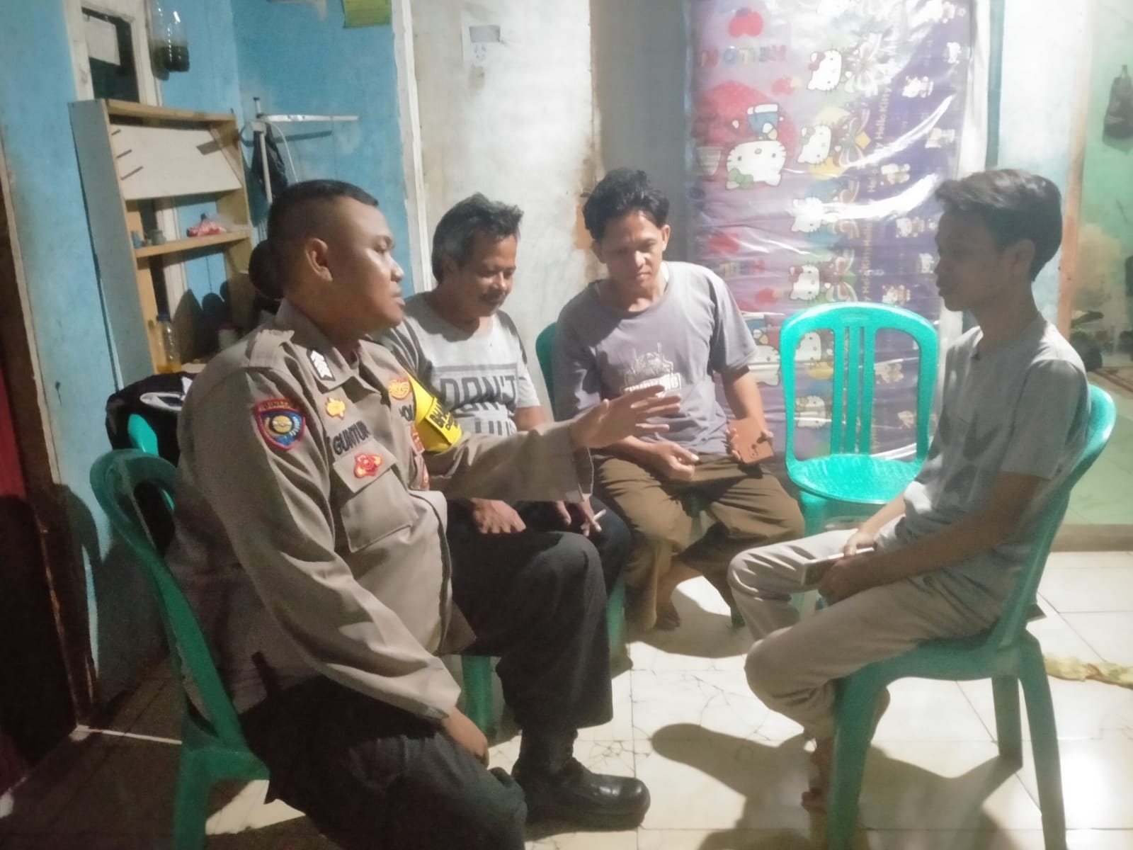 Citeureup – Polres Bogor, Bhabinkamtibmas Desa Gunung Sari Polsek Citeureup Polres Bogor Polda Jabar Bripka Guntur Pramono telah melaksanakan tugas Pelayanan Publik melalui Mengajak Pemuda di Desa untuk menjaga Kamtibmas dan aktif dalam kegiatan kepemudaan serta membantu Keamanan lingkungan dengan ikut berjaga di Pos Kamling, tadi malam (24/08/2023).