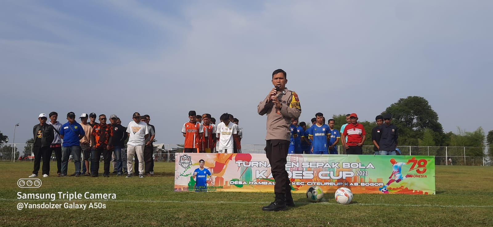 Citeureup – Polres Bogor, Bhabinkamtibmas Desa Hambalang Polsek Citeureup Polres Bogor Polda Jabar Aiptu M.Hambali telah melaksanakan tugas Pelayanan Publik melalui Pengamanan kegiatan Turnamen Sepakbola Kades Cup jelang HUT RI ke 78, kemarin (14/08/2023).